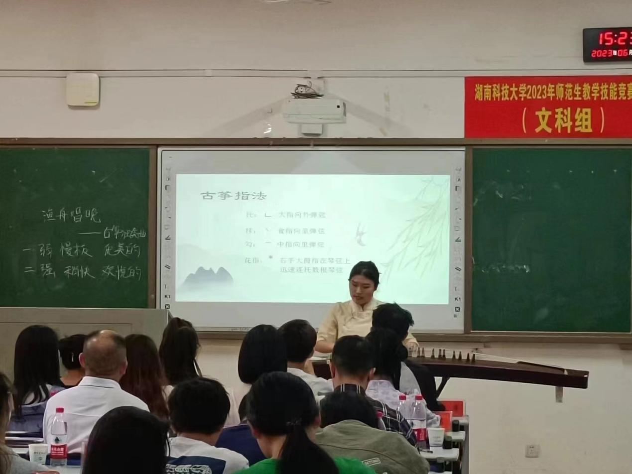 本次大赛分文理科组现场进行,包括教育问答和授课环节两个,在教育问答环节,三位同学沉着冷静,信心十足,充分展现了扎实的理论基础和显著的学习效果,在授课环节雷雨同学从容不迫,全身心投入讲课,将教授内容与课堂氛围巧妙结合,身着民族服饰带领学生用身体感受音乐,最终凭借富有创意的教学设计、灵活的细节把控以及较强的综合素质在本次大赛文科组中脱颖而出,斩获第六名。邓玉苹同学的课堂感染力也很强,也十分强调师生互动,兼具优秀的音乐专业素养,教唱环节与奥尔夫打击乐器编创环节的课堂氛围十分活跃,教学环节设计也紧扣教学目标,收到评委老师的一致好评,取得了第九名的好成绩。周佳铭同学通过与古诗句结合把大家引入所学的古筝曲中,让学生对民族乐器有所了解并体验古筝的弹奏技法,又通过唱和晚的描述使人身临其境,教学设计环环相扣,最终收获了第十名的好成绩。