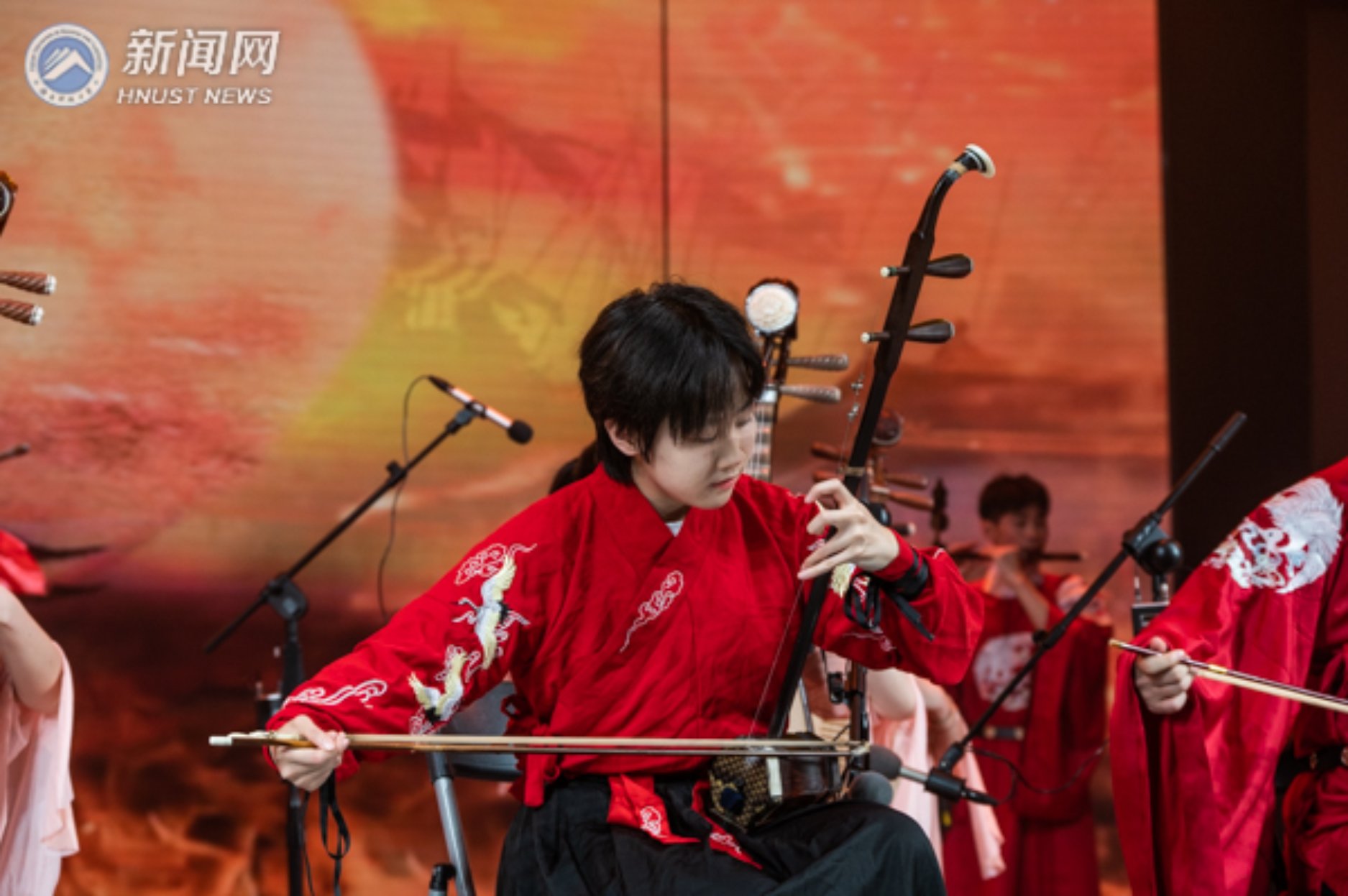 “3、2、1……”民乐合奏《象王行》以鼓开场,融合古筝、二胡等乐器,奏响悠长高昂、热情奔放的旋律,拉开了晚会序幕,点燃了现场观众的热情,掀起了现场的火爆气氛。艺术舞蹈班带来的古典舞《橘颂》将观众带入南楚那段历史中,表演者们在舞台上千姿百态,婀娜多姿的身影如同橘树的化身,以此歌颂诗人屈原扎根热土的高尚品格。