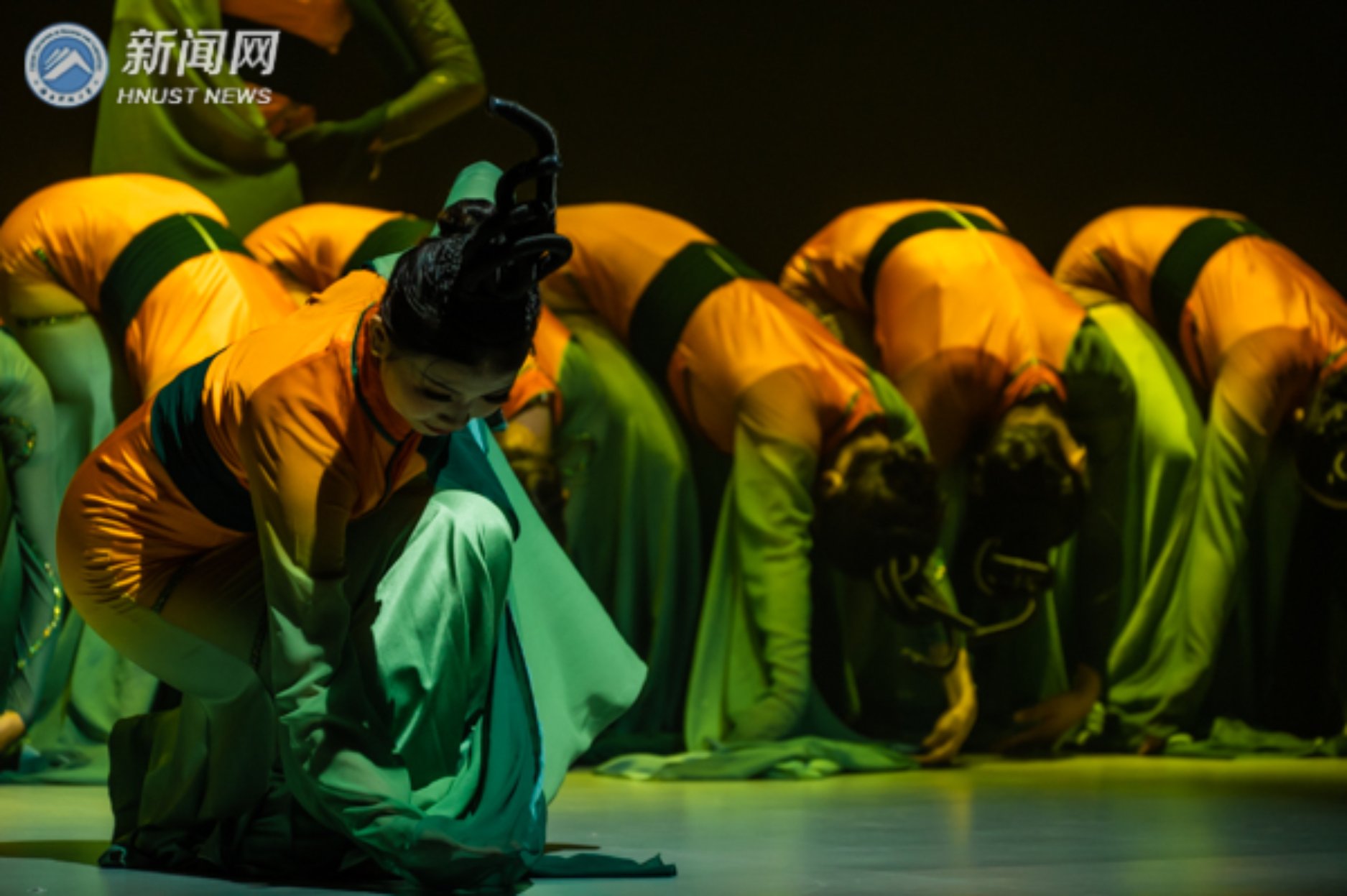 “3、2、1……”民乐合奏《象王行》以鼓开场,融合古筝、二胡等乐器,奏响悠长高昂、热情奔放的旋律,拉开了晚会序幕,点燃了现场观众的热情,掀起了现场的火爆气氛。艺术舞蹈班带来的古典舞《橘颂》将观众带入南楚那段历史中,表演者们在舞台上千姿百态,婀娜多姿的身影如同橘树的化身,以此歌颂诗人屈原扎根热土的高尚品格。
